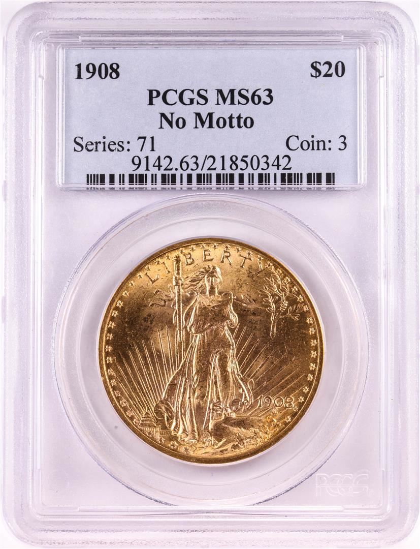 One 1908 No Motto $20 St. Gaudens Double Eagle Gold Coin PCGS MS63. PCGS Graded.