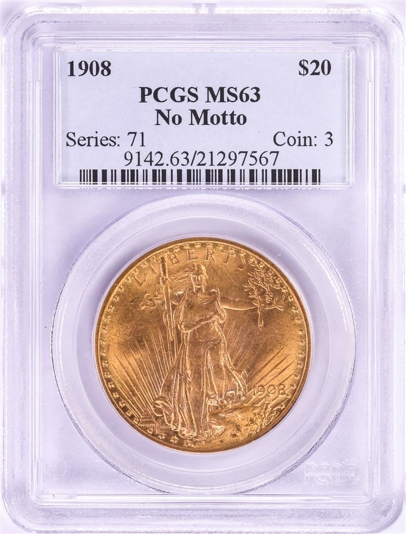 One 1908 No Motto $20 St. Gaudens Double Eagle Gold Coin PCGS MS63. PCGS Graded.
