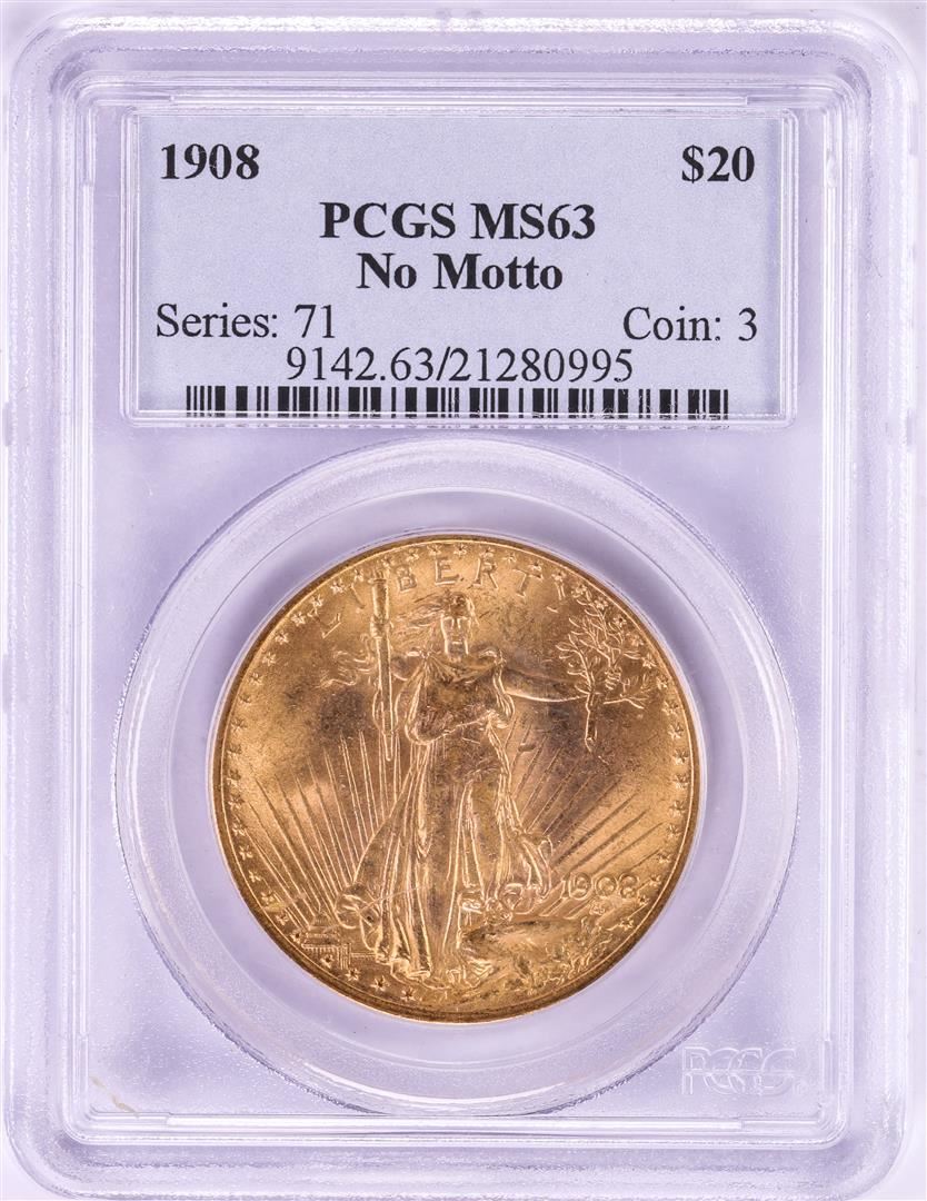 One 1908 No Motto $20 St. Gaudens Double Eagle Gold Coin PCGS MS63. PCGS Graded.