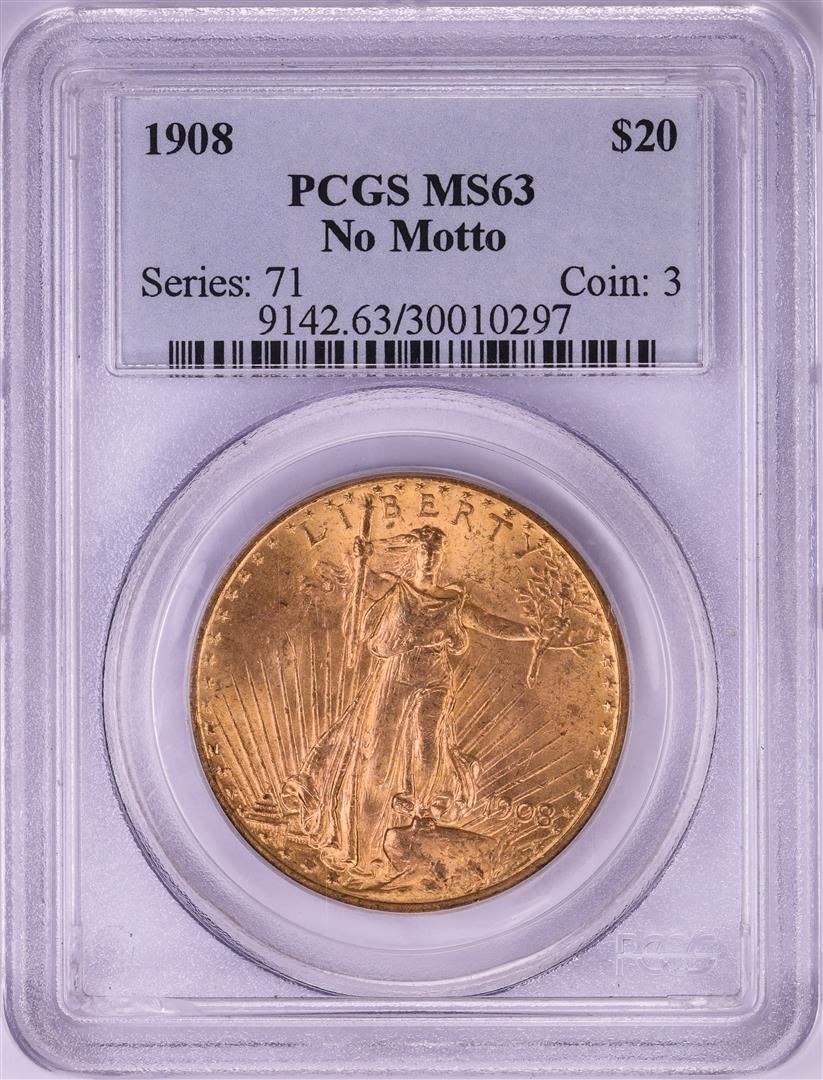 One 1908 No Motto $20 St. Gaudens Double Eagle Gold Coin PCGS MS63. PCGS Graded.