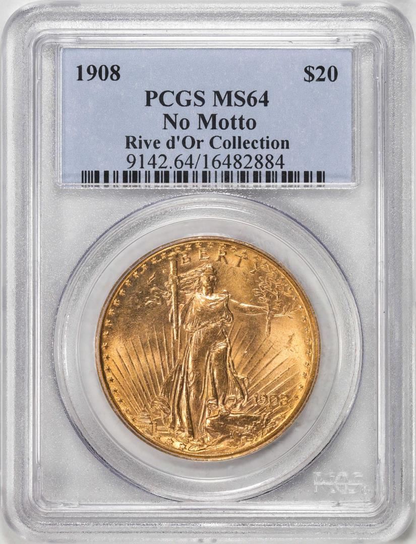 One 1908 No Motto $20 St. Gaudens Double Eagle Gold Coin PCGS MS64 Rive d' Or Collection. PCGS Graded.