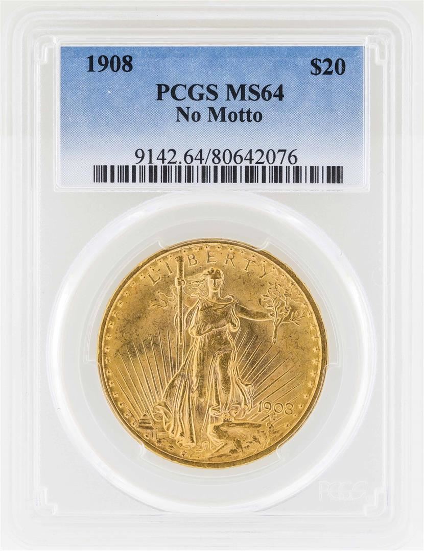 One 1908 No Motto $20 St. Gaudens Double Eagle Gold Coin PCGS MS64. PCGS Graded.