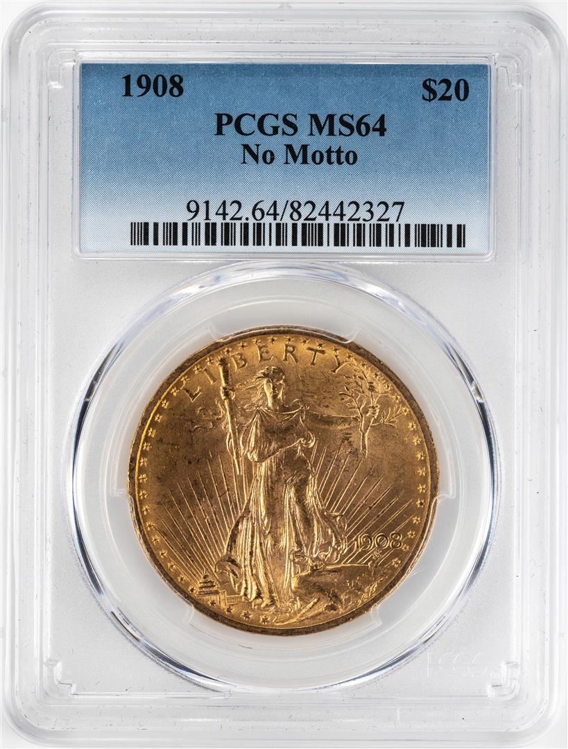 One 1908 No Motto $20 St. Gaudens Double Eagle Gold Coin PCGS MS64. PCGS Graded.