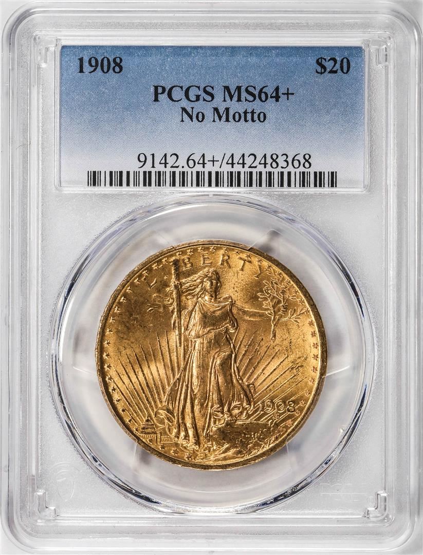 One 1908 No Motto $20 St Gaudens Double Eagle Gold Coin PCGS MS64+. PCGS Graded.