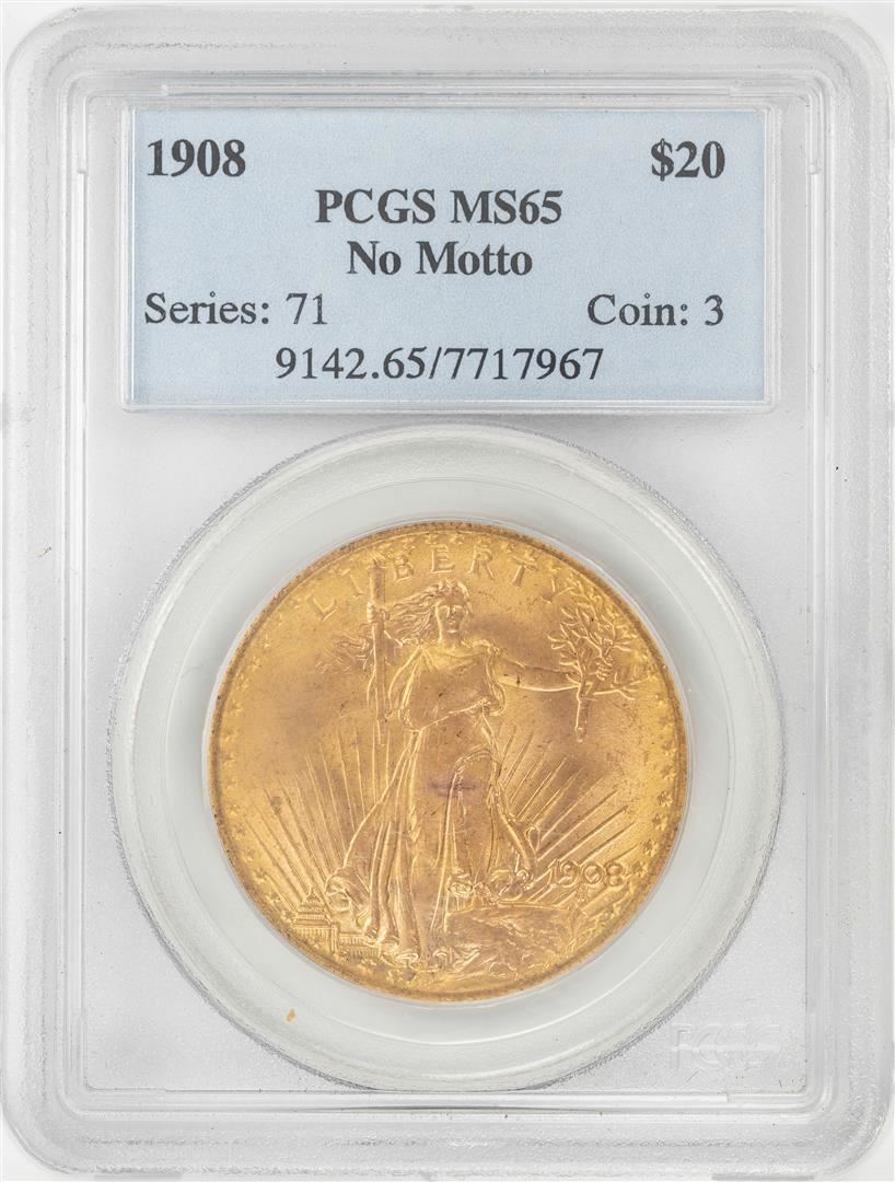 One 1908 No Motto $20 St. Gaudens Double Eagle Gold Coin PCGS MS65. PCGS Graded.