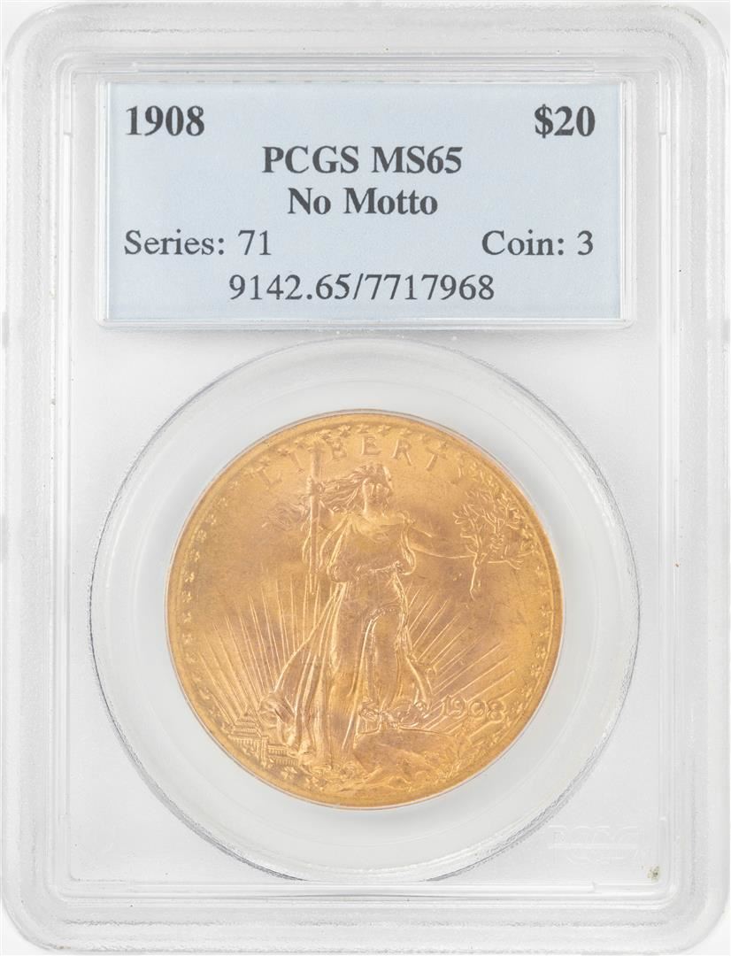 One 1908 No Motto $20 St Gaudens Double Eagle Gold Coin PCGS MS65. PCGS Graded.