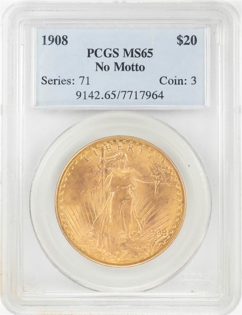 One 1908 No Motto $20 St Gaudens Double Eagle Gold Coin PCGS MS65. PCGS Graded.