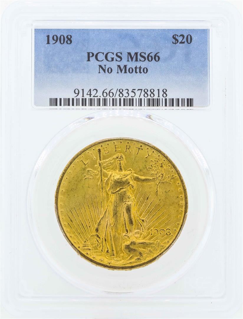 One 1908 No Motto $20 St. Gaudens Double Eagle Gold Coin PCGS MS66. PCGS Graded.