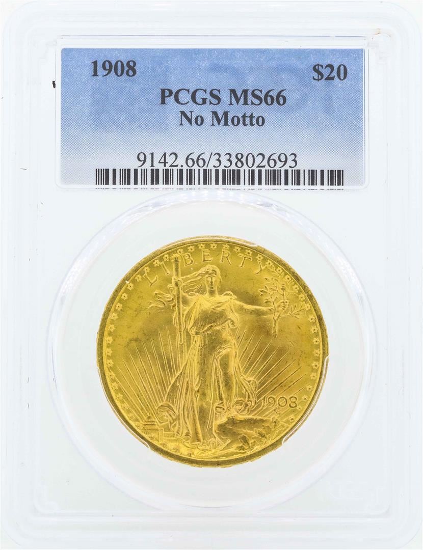 One 1908 No Motto $20 St. Gaudens Double Eagle Gold Coin PCGS MS66. PCGS Graded.