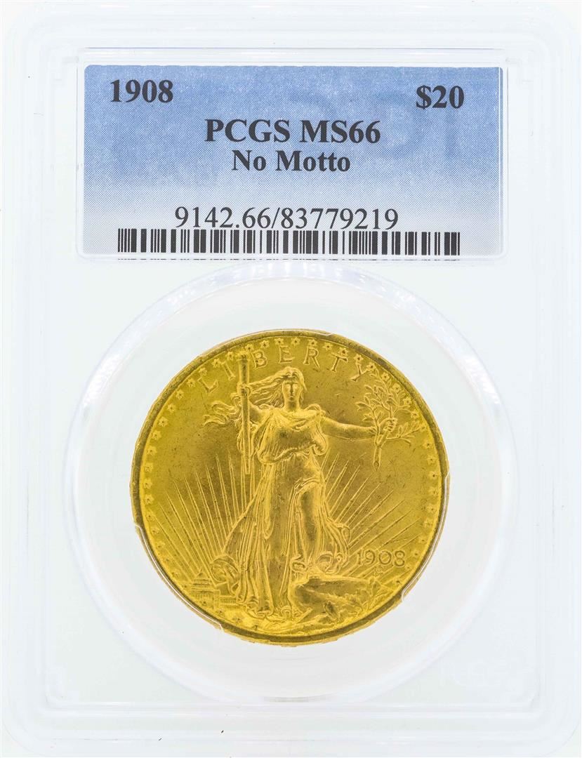 One 1908 No Motto $20 St. Gaudens Double Eagle Gold Coin PCGS MS66. PCGS Graded.