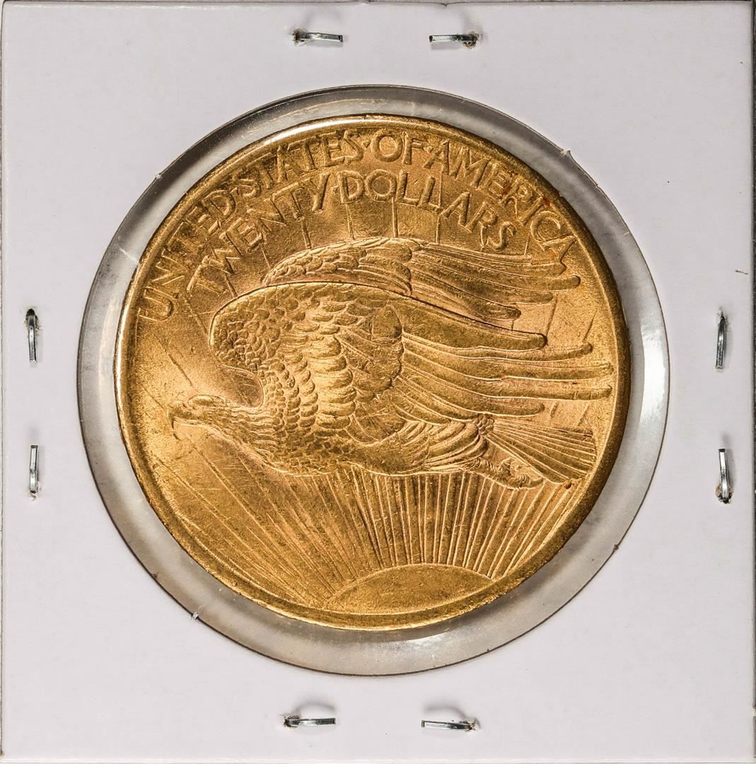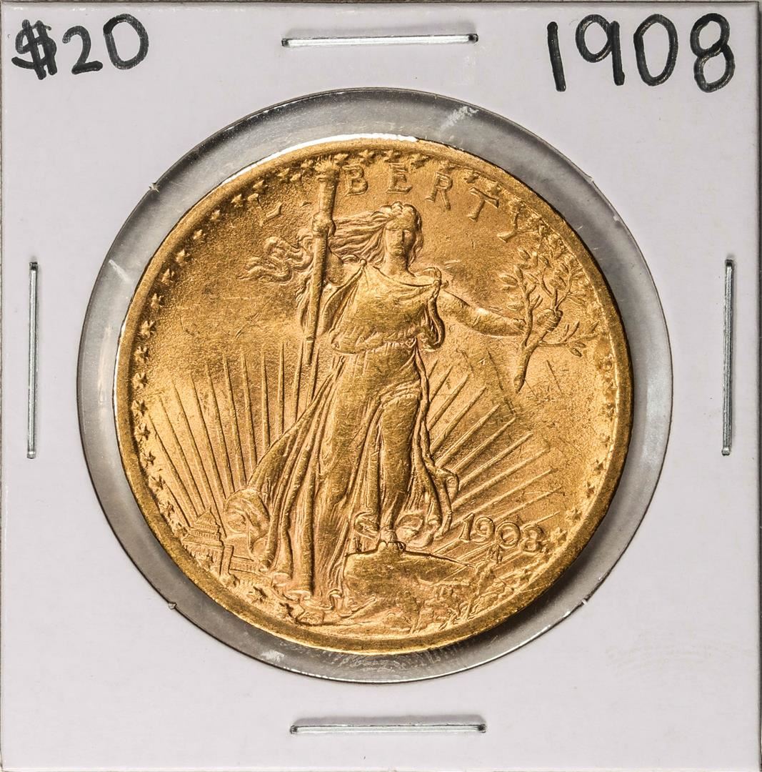 One 1908 No Motto $20 St. Gaudens Double Eagle Gold Coin.