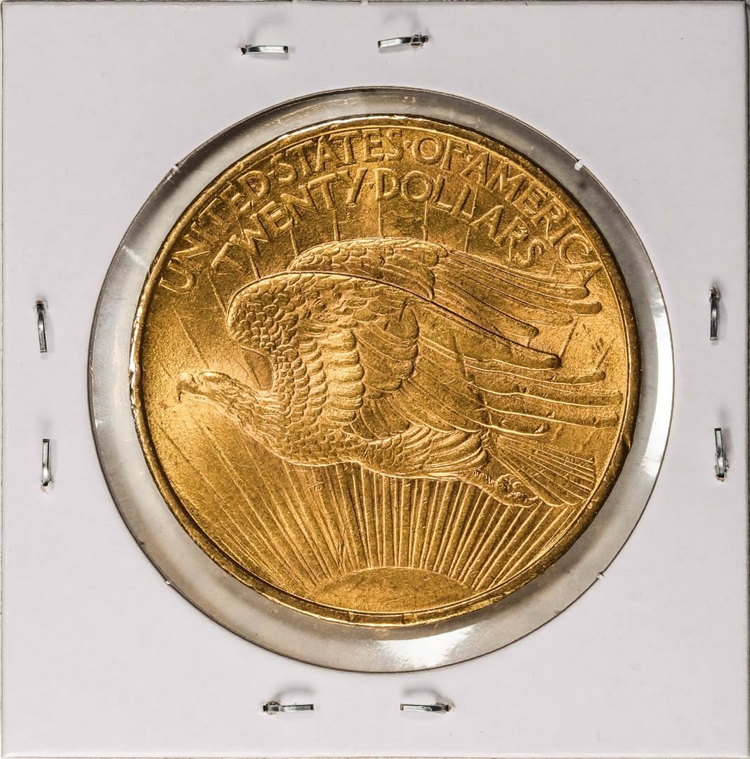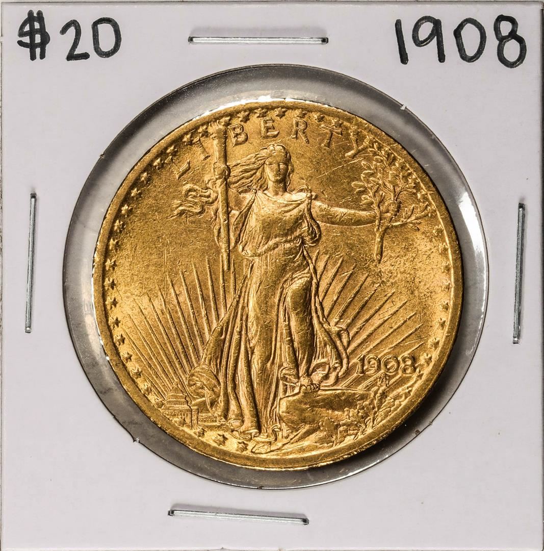 One 1908 No Motto $20 St. Gaudens Double Eagle Gold Coin.