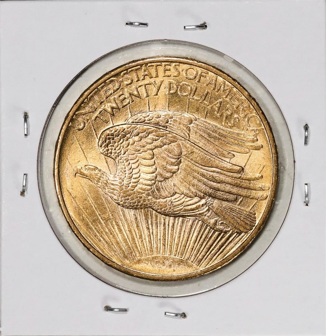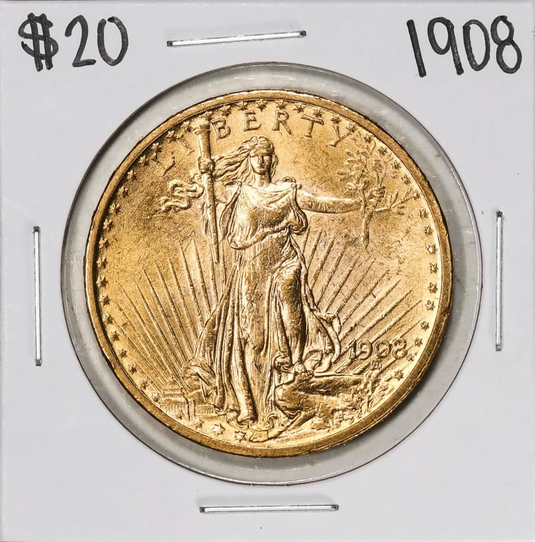 One 1908 No Motto $20 St. Gaudens Double Eagle Gold Coin.