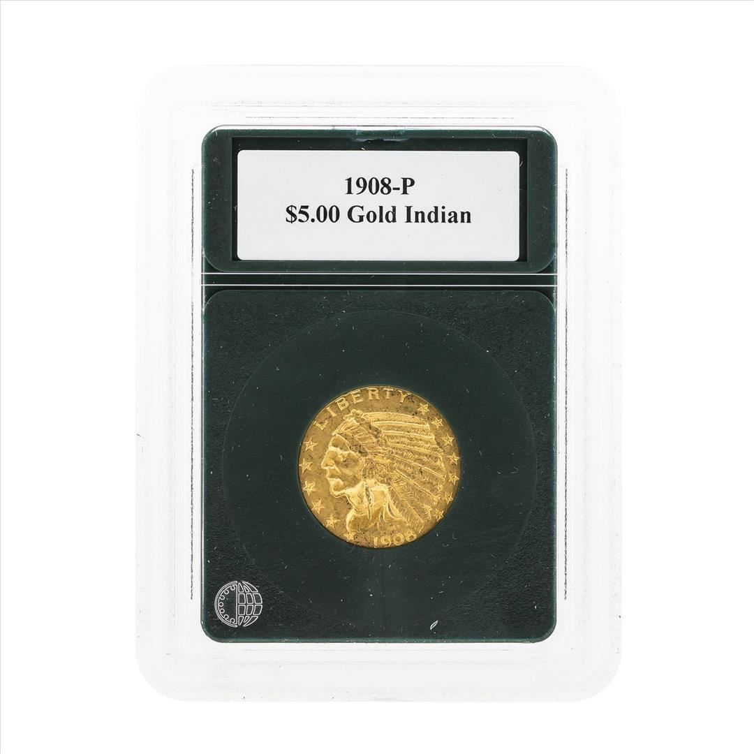 One 1908-P $5 Indian Head Half Eagle Gold Coin.