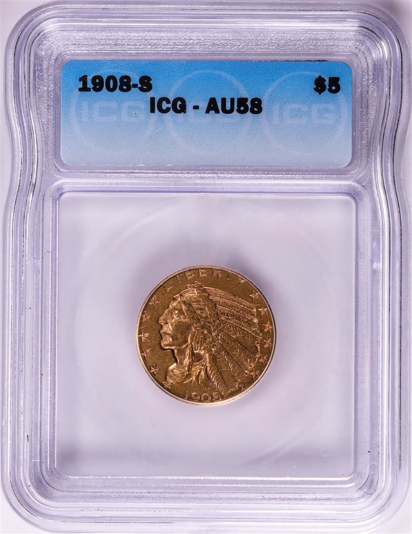 One 1908-S $5 Indian Head Half Eagle Gold Coin ICG AU58. ICG Certified.