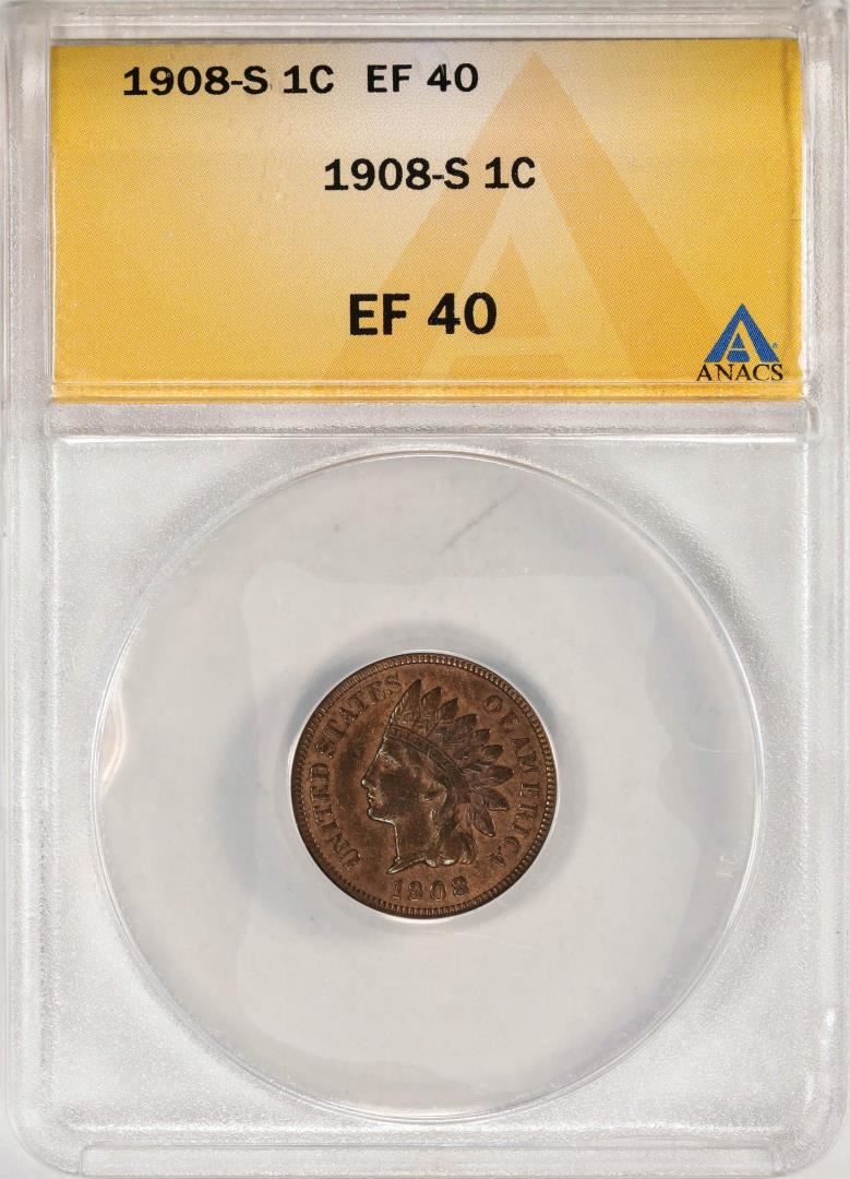 One 1908-S Indian Head Cent Coin ANACS EF40. ANACS Certified.