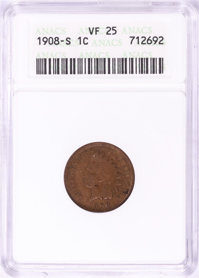 One 1908-S Indian Head Cent Coin ANACS VF25. ANACS Certified.