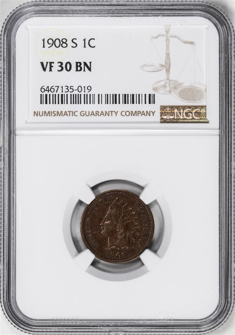 One 1908-S Indian Head Cent Coin NGC VF30BN. NGC Certified.