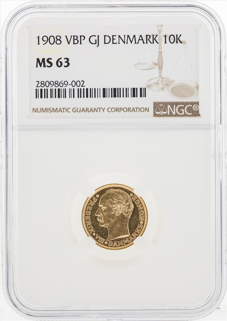 One 1908 VBP GJ Denmark 10 Kroner Gold Coin NGC MS63. NGC Certified.