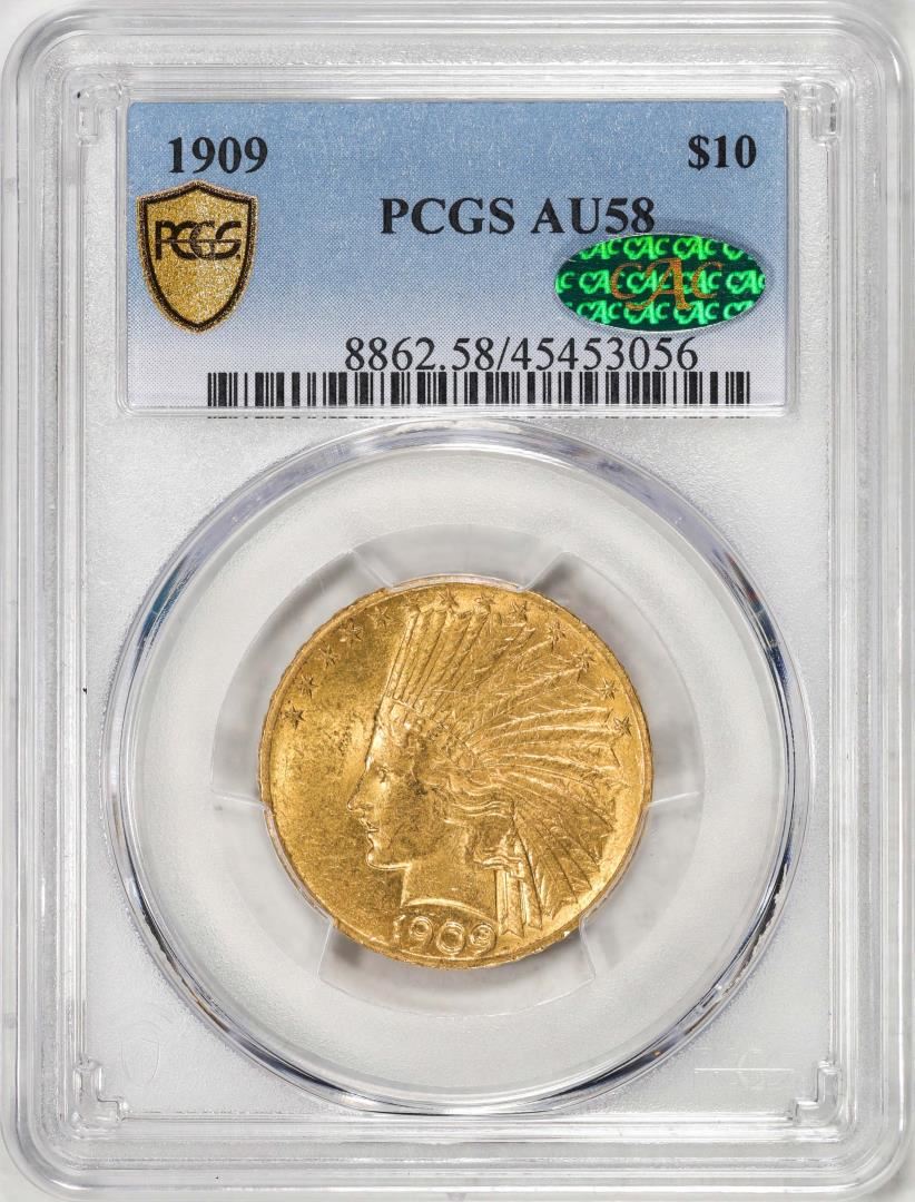 One 1909 $10 Indian Head Eagle Gold Coin PCGS AU58 CAC. PCGS Graded.