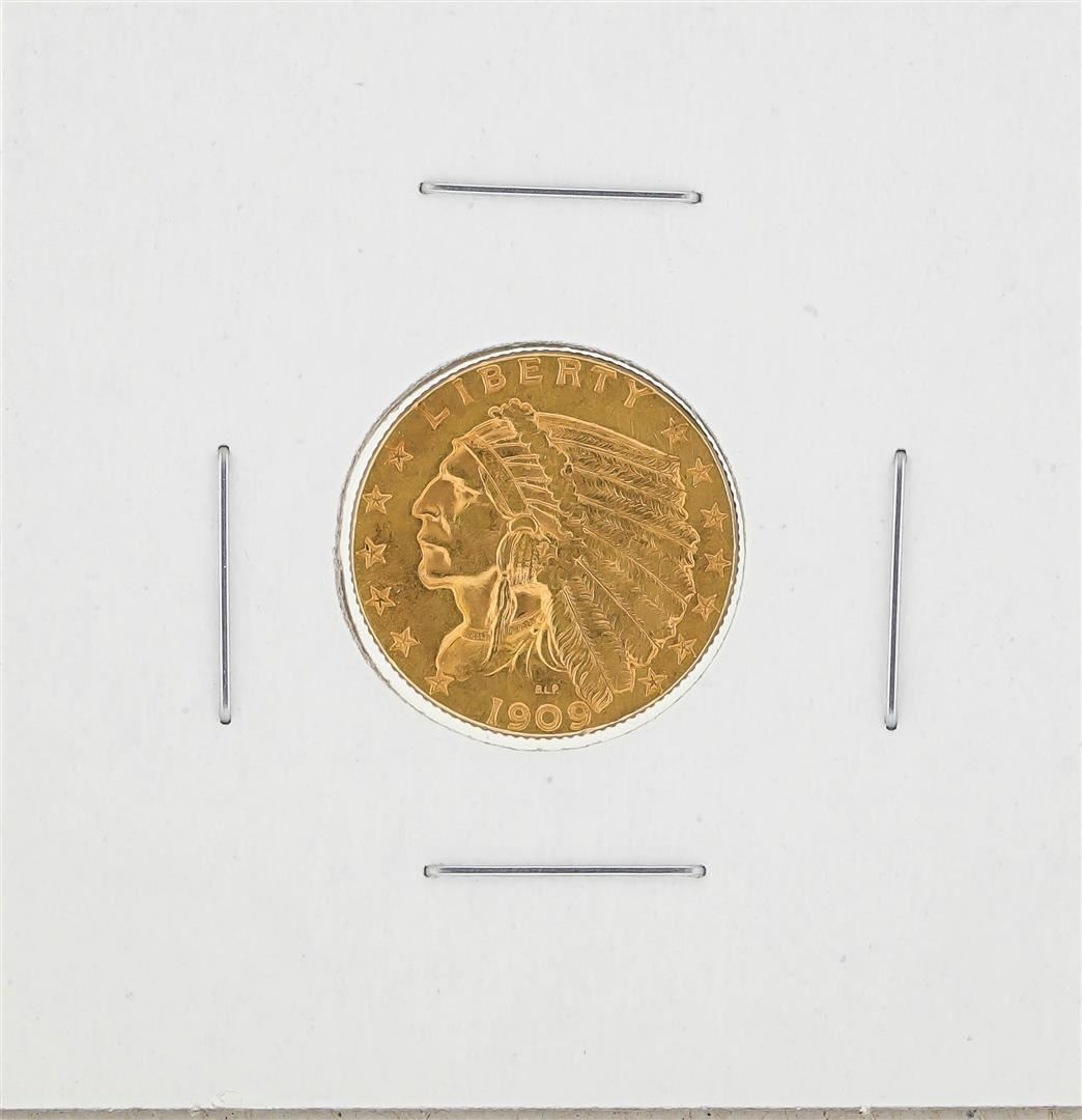 One 1909 $2 1/2 Indian Head Quarter Eagle Gold Coin.