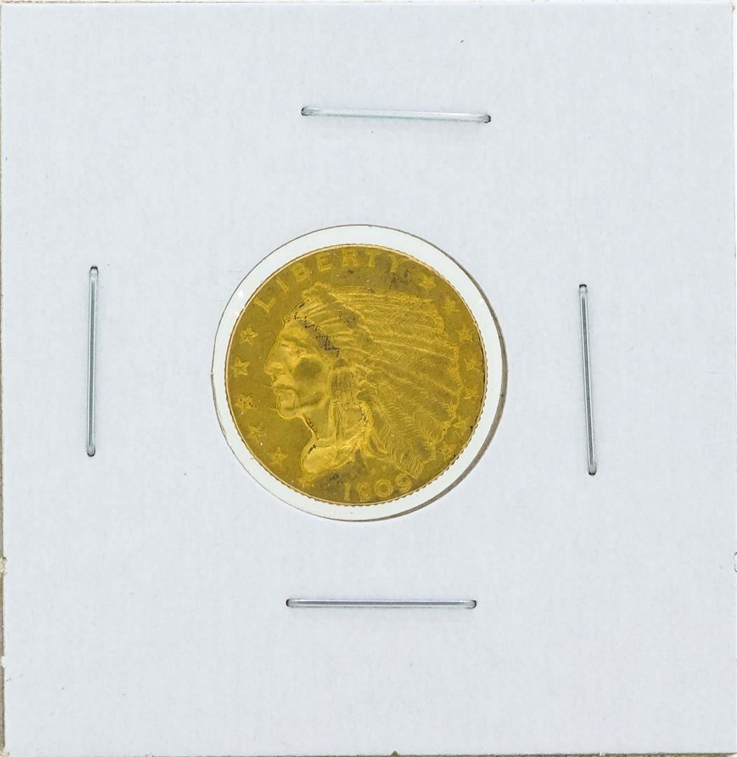 One 1909 $2 1/2 Indian Head Quarter Eagle Gold Coin.