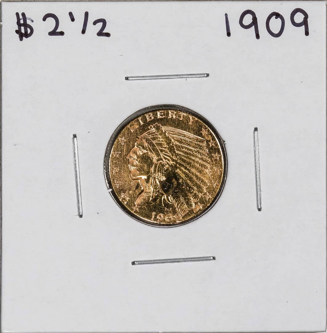 One 1909 $2 1/2 Indian Head Quarter Eagle Gold Coin, please note there is some damage to the coin as shown in the pictures.