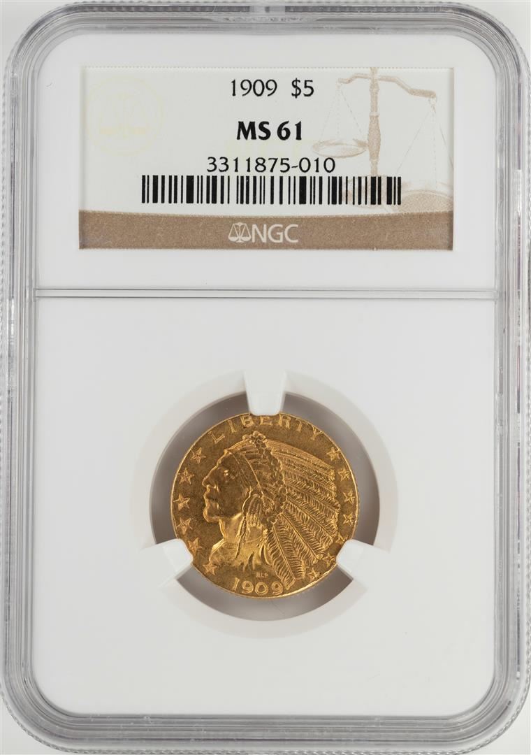 1909 $5 Indian Head Half Eagle Gold Coin NGC MS61