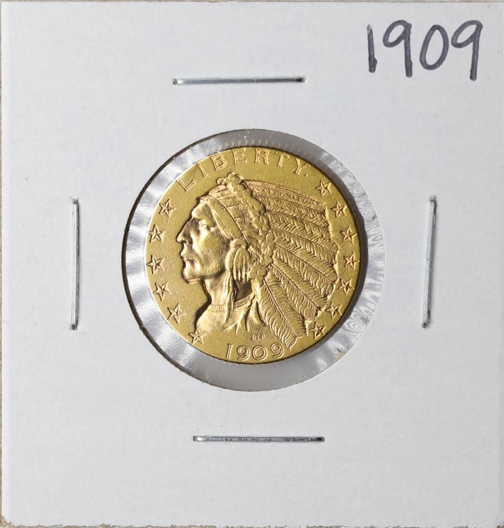One 1909 $5 Indian Head Half Eagle Gold Coin.