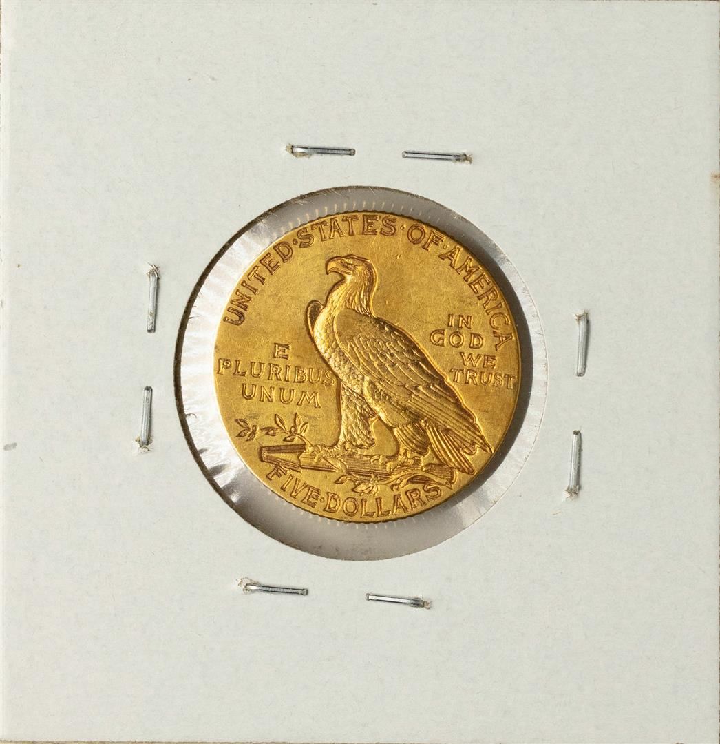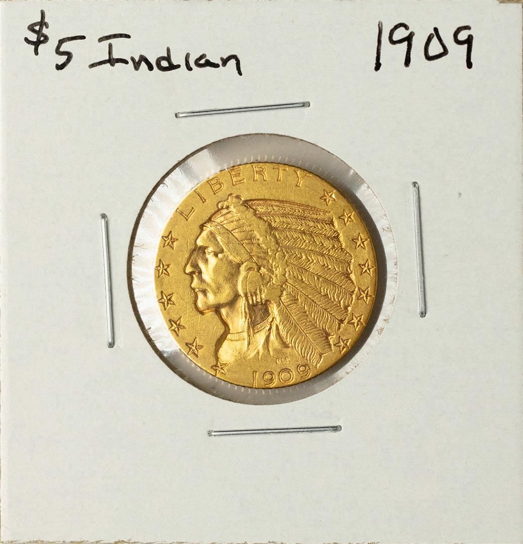 One 1909 $5 Indian Head Half Eagle Gold Coin.