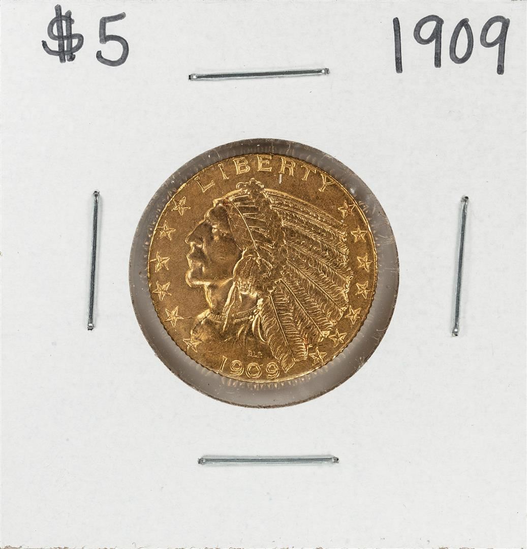 One 1909 $5 Indian Head Half Eagle Gold Coin.
