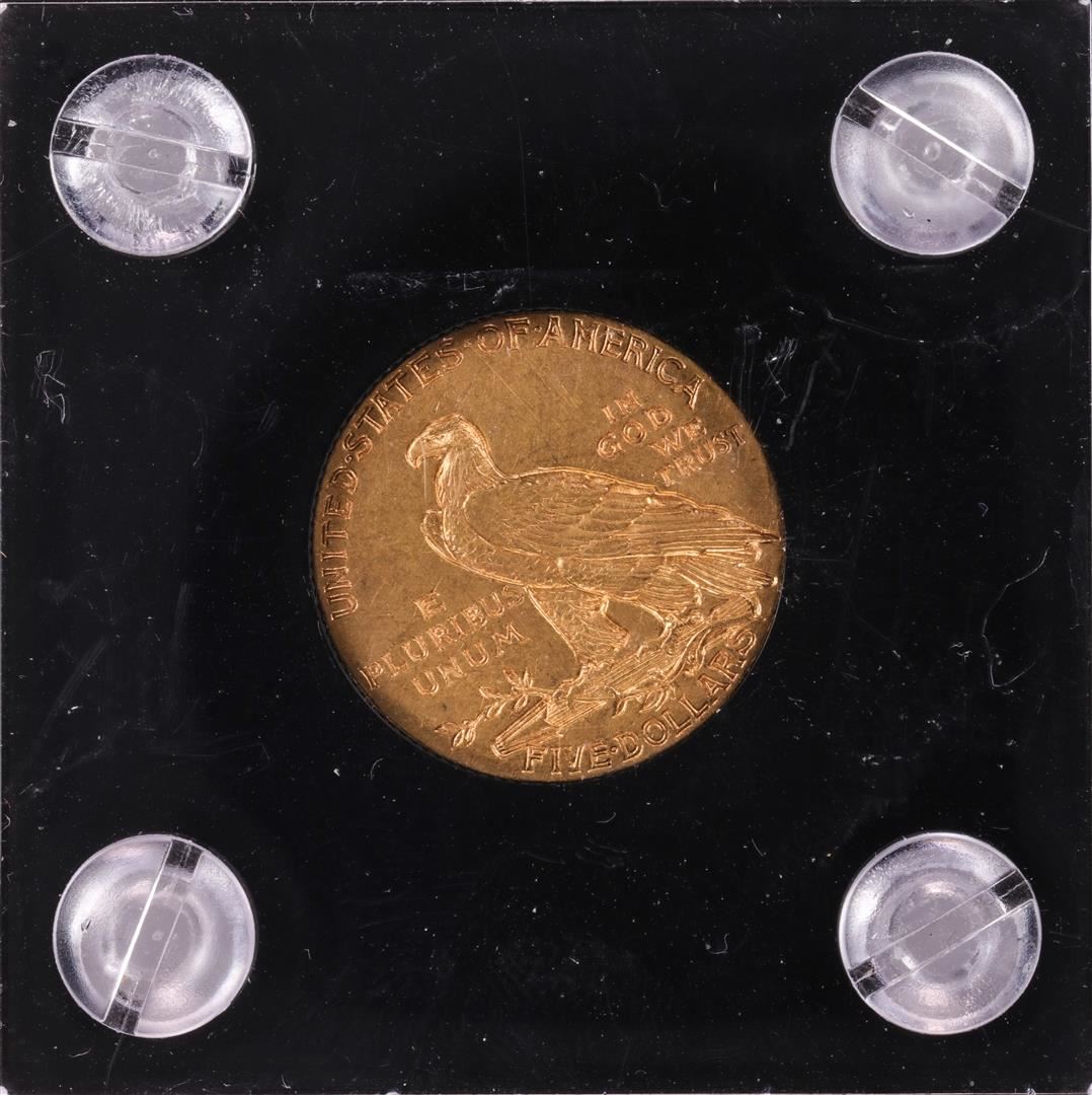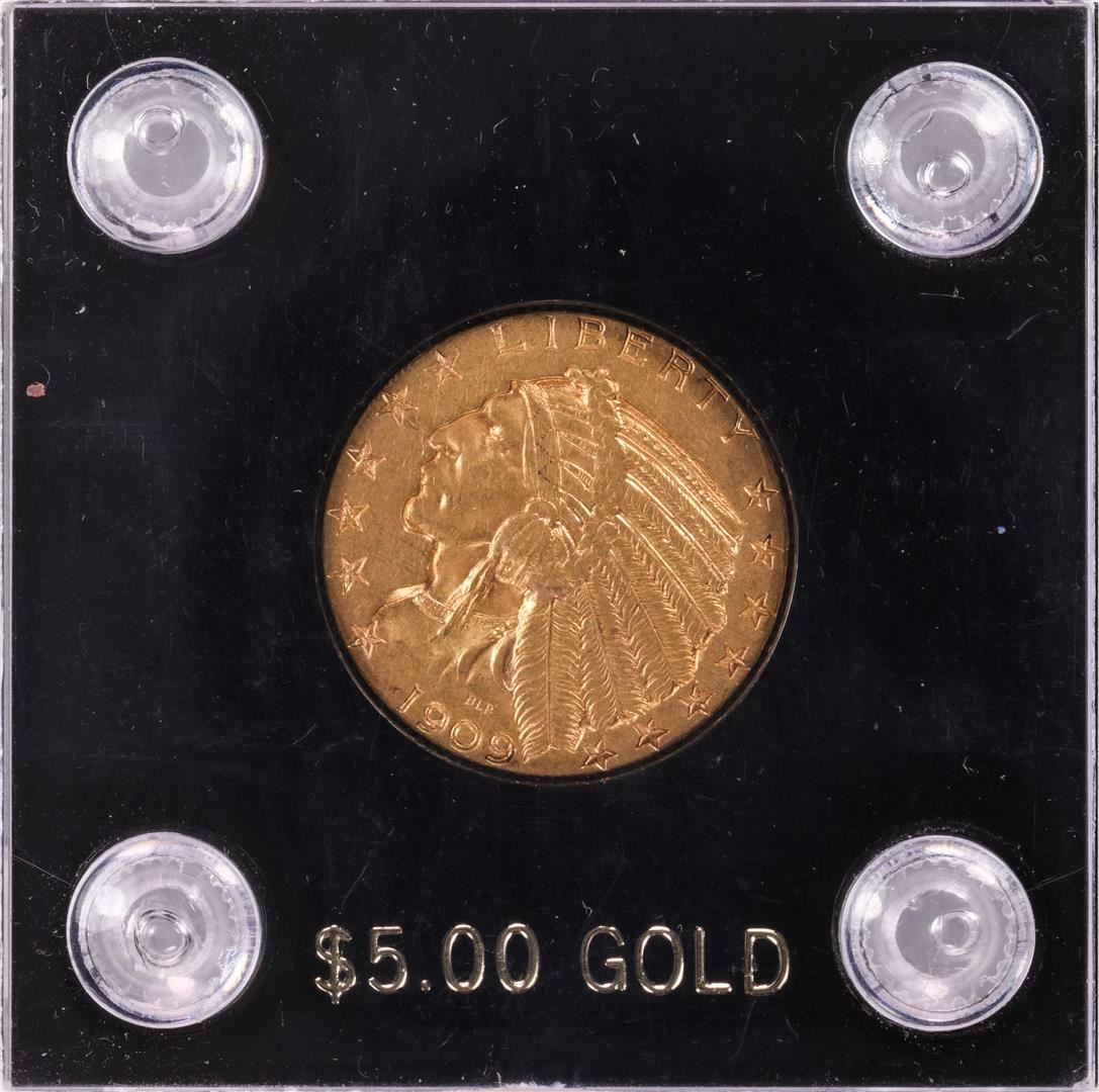 One 1909 $5 Indian Head Half Eagle Gold Coin.