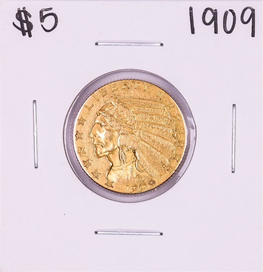 One 1909 $5 Indian Head Half Eagle Gold Coin.