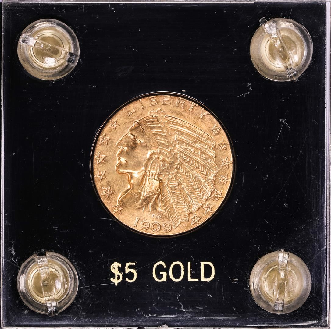 One 1909 $5 Indian Head Half Eagle Gold Coin.