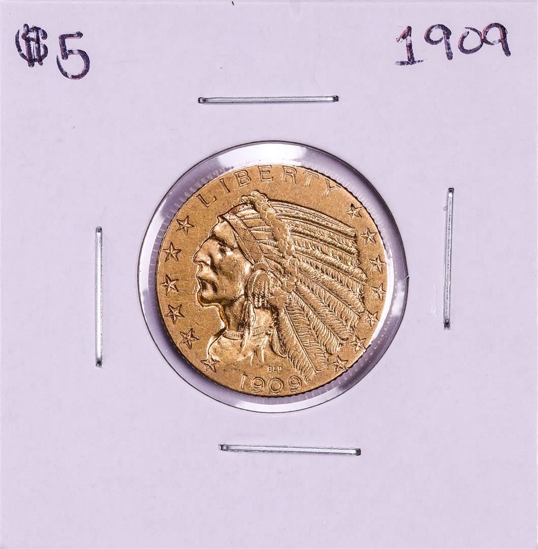One 1909 $5 Indian Head Half Eagle Gold Coin.