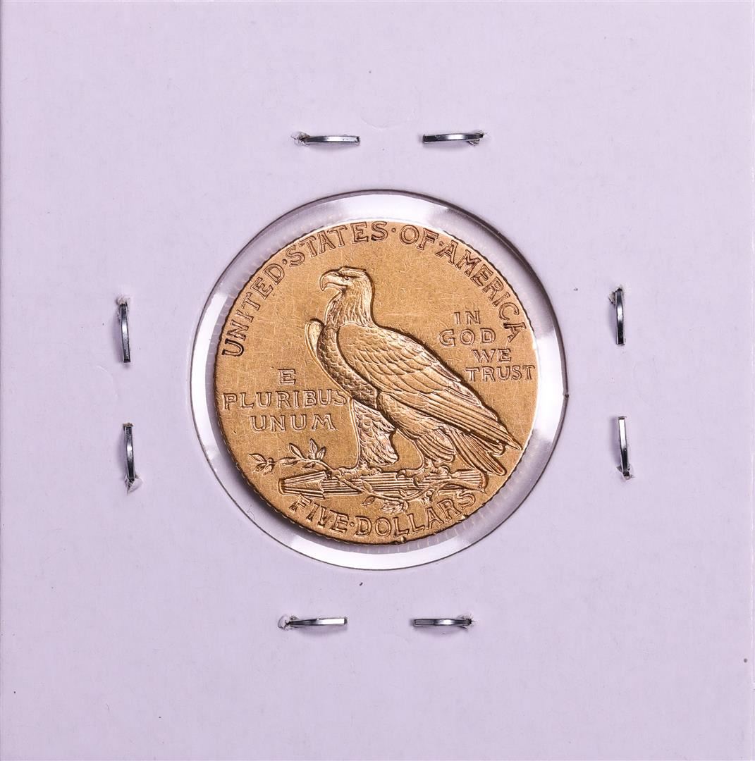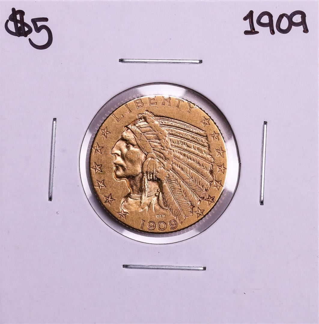 One 1909 $5 Indian Head Half Eagle Gold Coin.