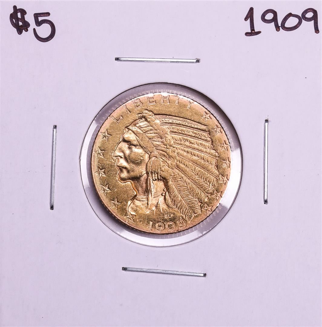 One 1909 $5 Indian Head Half Eagle Gold Coin.