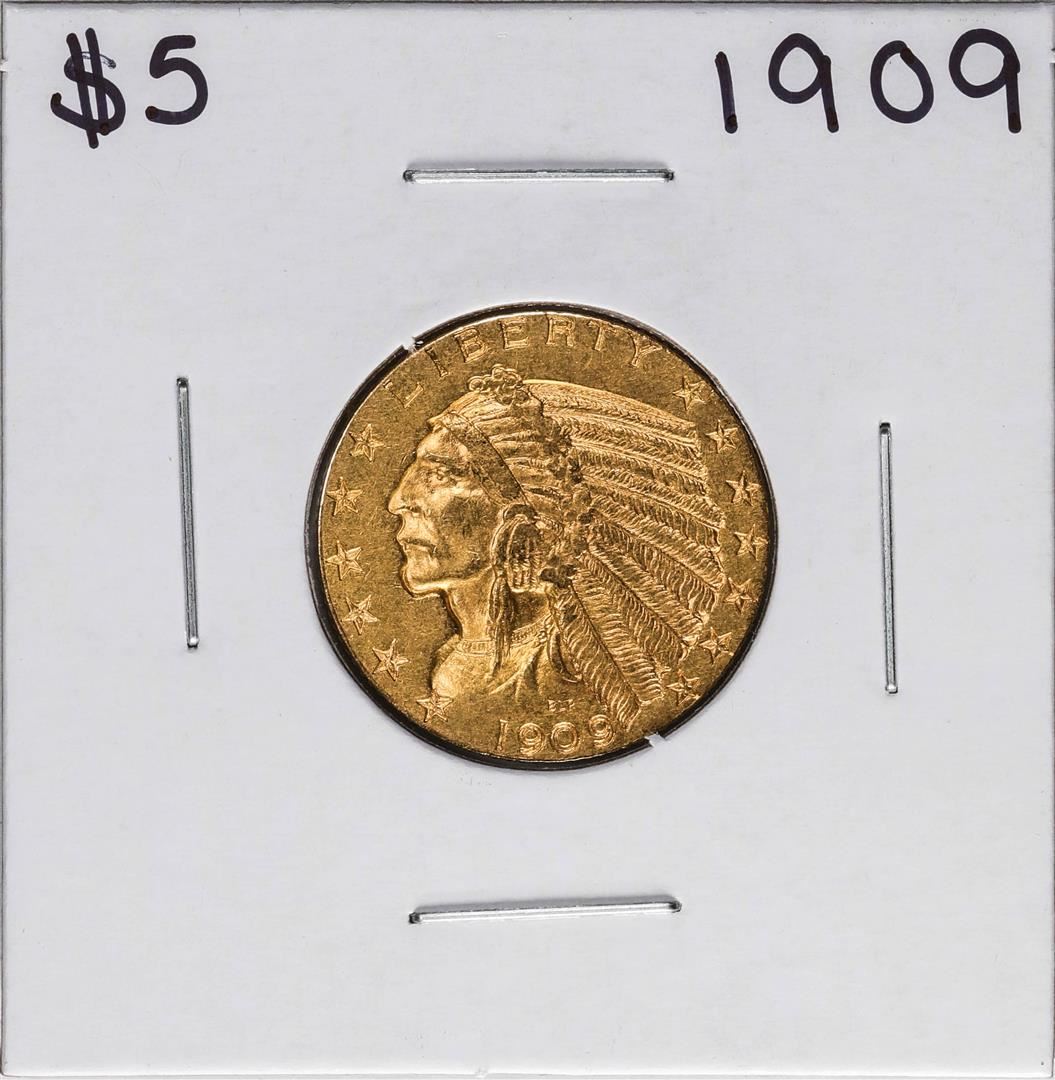 One 1909 $5 Indian Head Half Eagle Gold Coin.