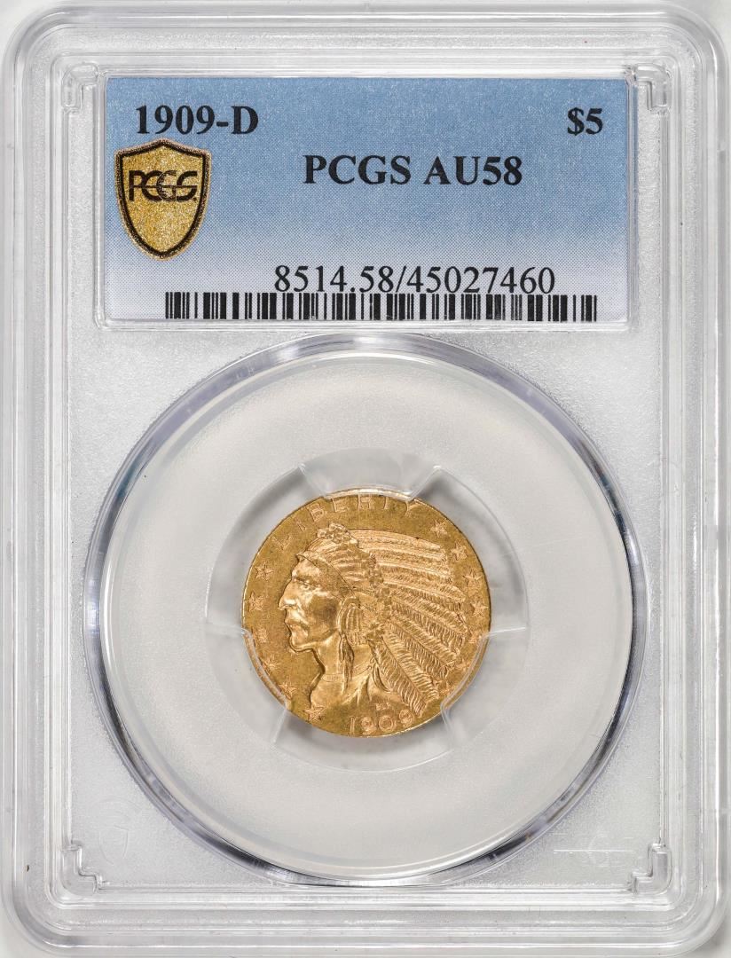One 1909-D $5 Indian Head Gold Coin PCGS AU58. PCGS Graded.