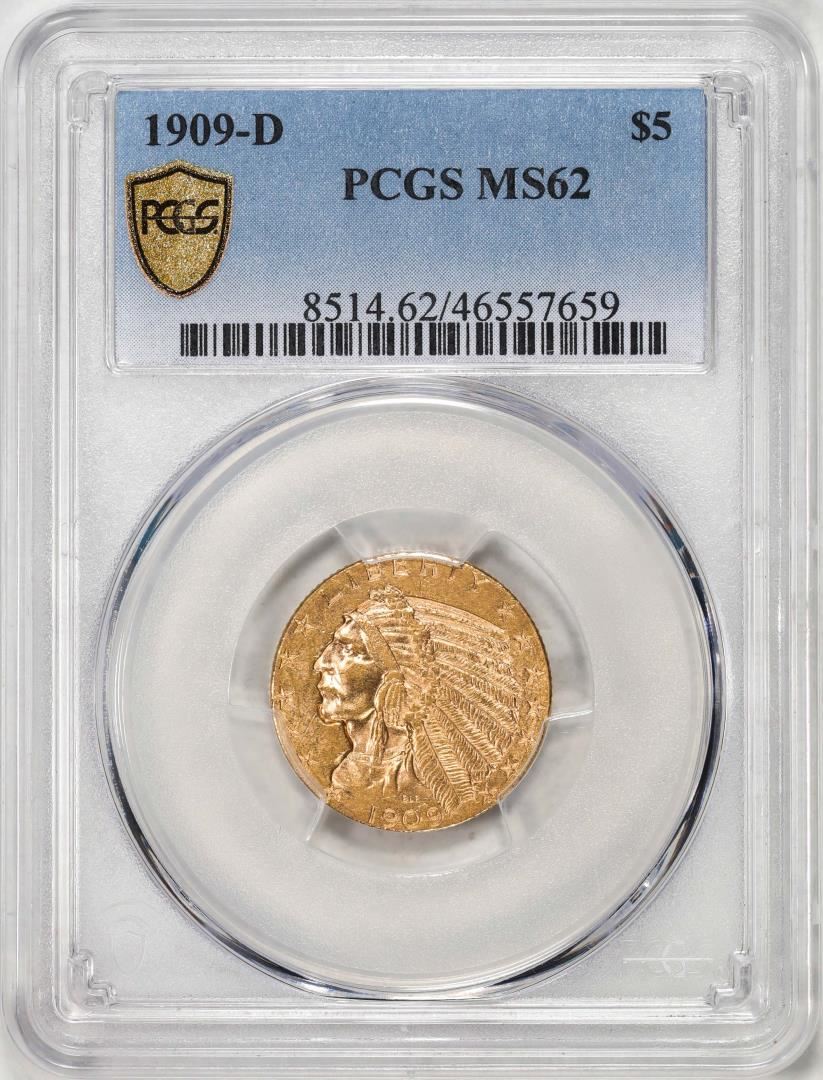 One 1909-D $5 Indian Head Gold Coin PCGS MS62. PCGS Graded.