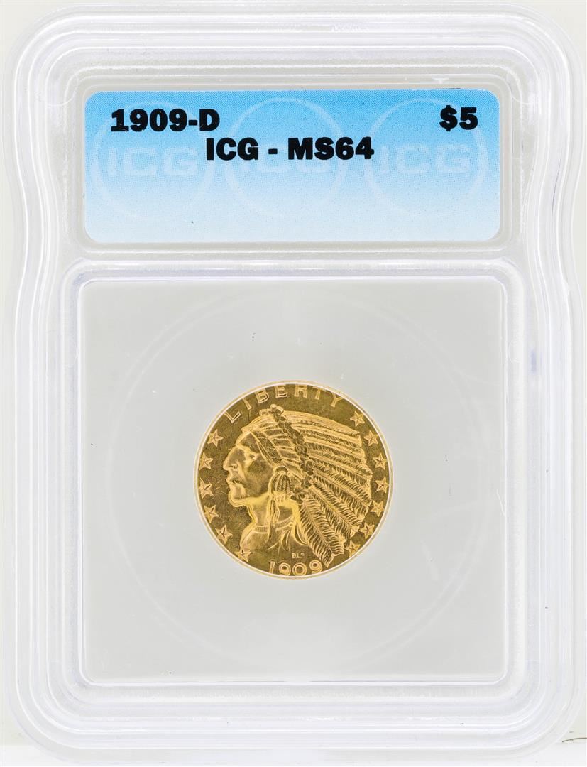 One 1909-D $5 Indian Head Half Eagle Gold Coin ICG MS64. ICG Certified.