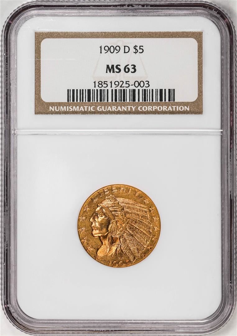 One 1909-D $5 Indian Head Half Eagle Gold Coin NGC MS63. NGC Certified.