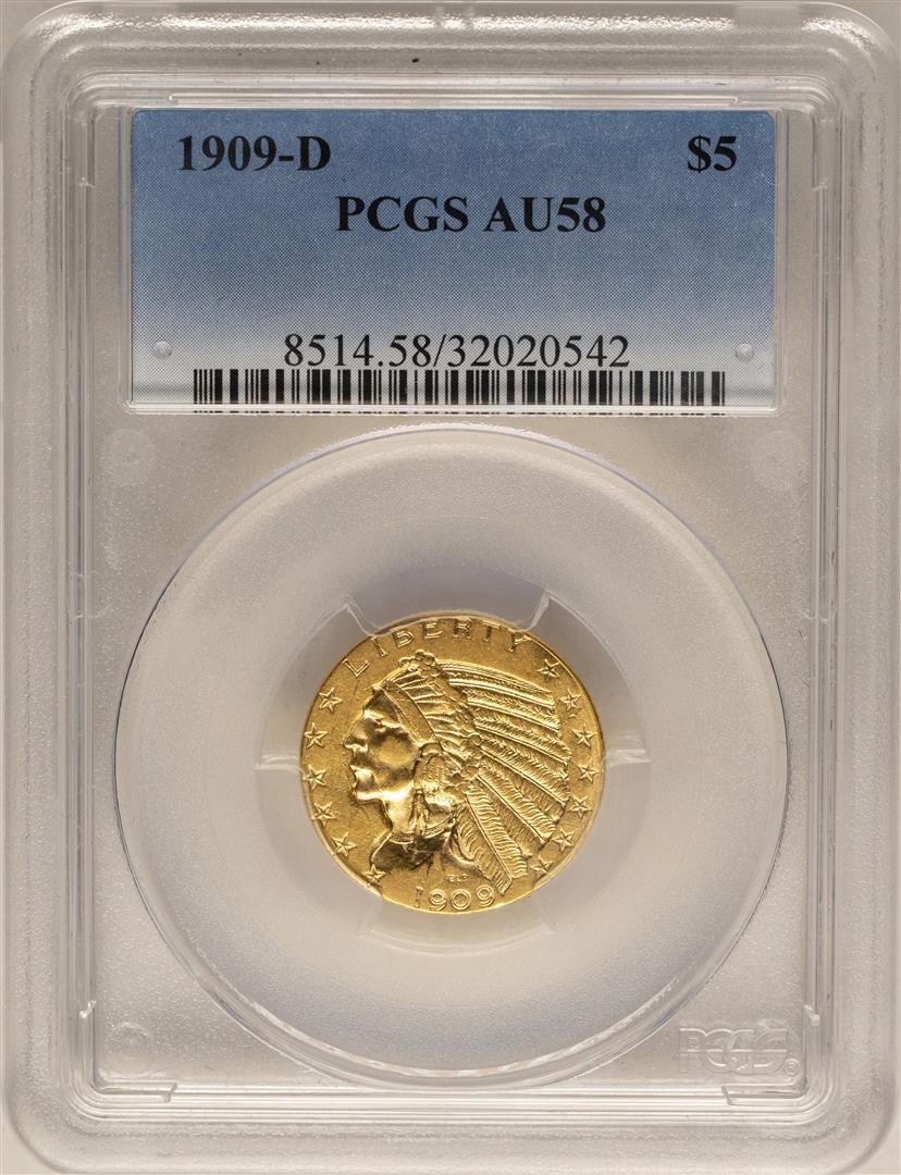 One 1909-D $5 Indian Head Half Eagle Gold Coin PCGS AU58. PCGS Graded.