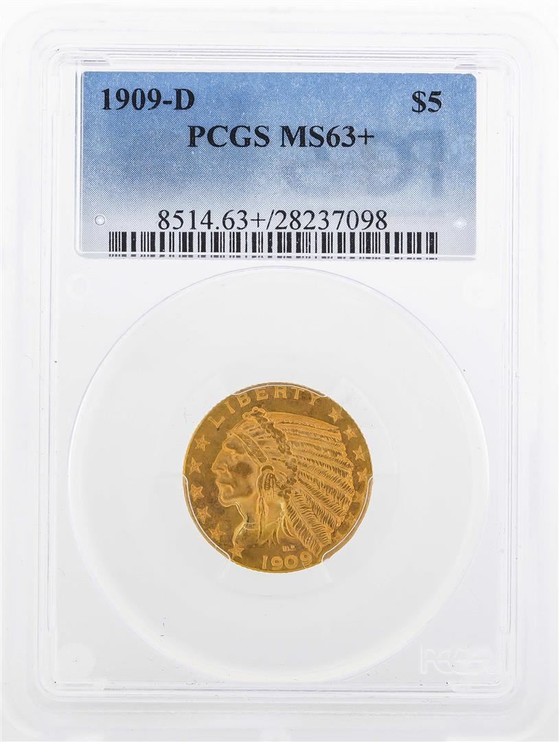 One 1909-D $5 Indian Head Half Eagle Gold Coin PCGS MS63+. PCGS Graded.