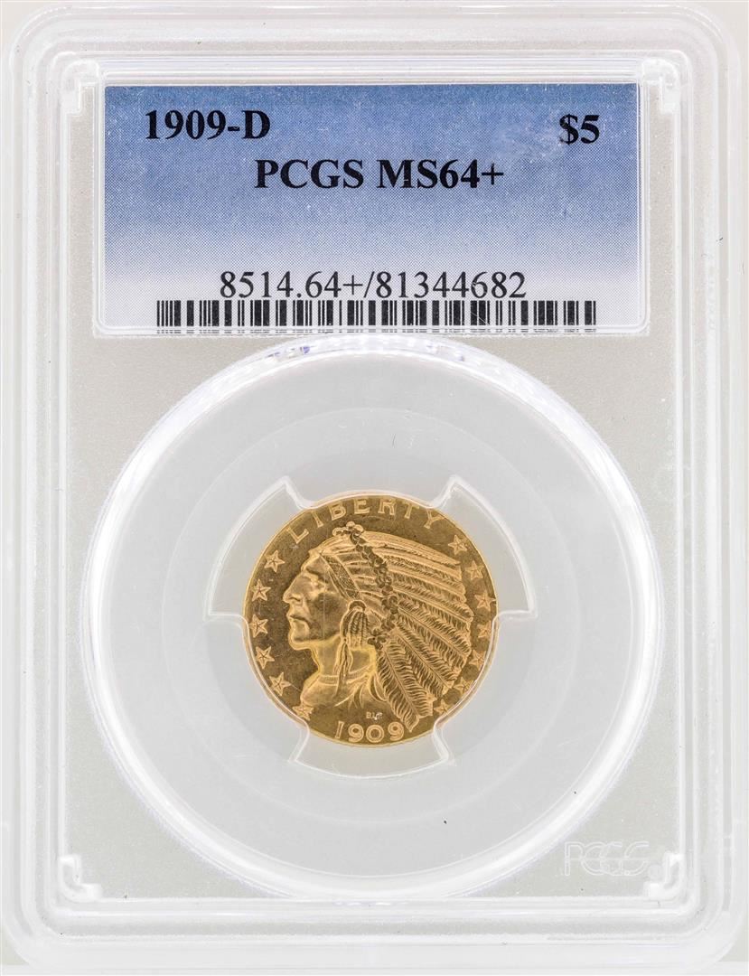 One 1909-D $5 Indian Head Half Eagle Gold Coin PCGS MS64+. PCGS Graded.