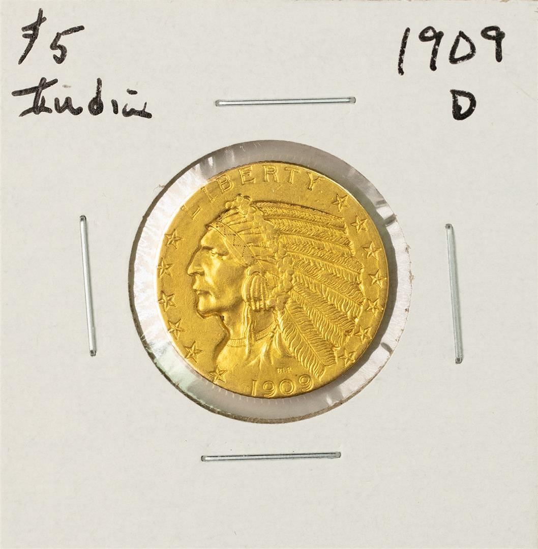 One 1909-D $5 Indian Head Half Eagle Gold Coin.
