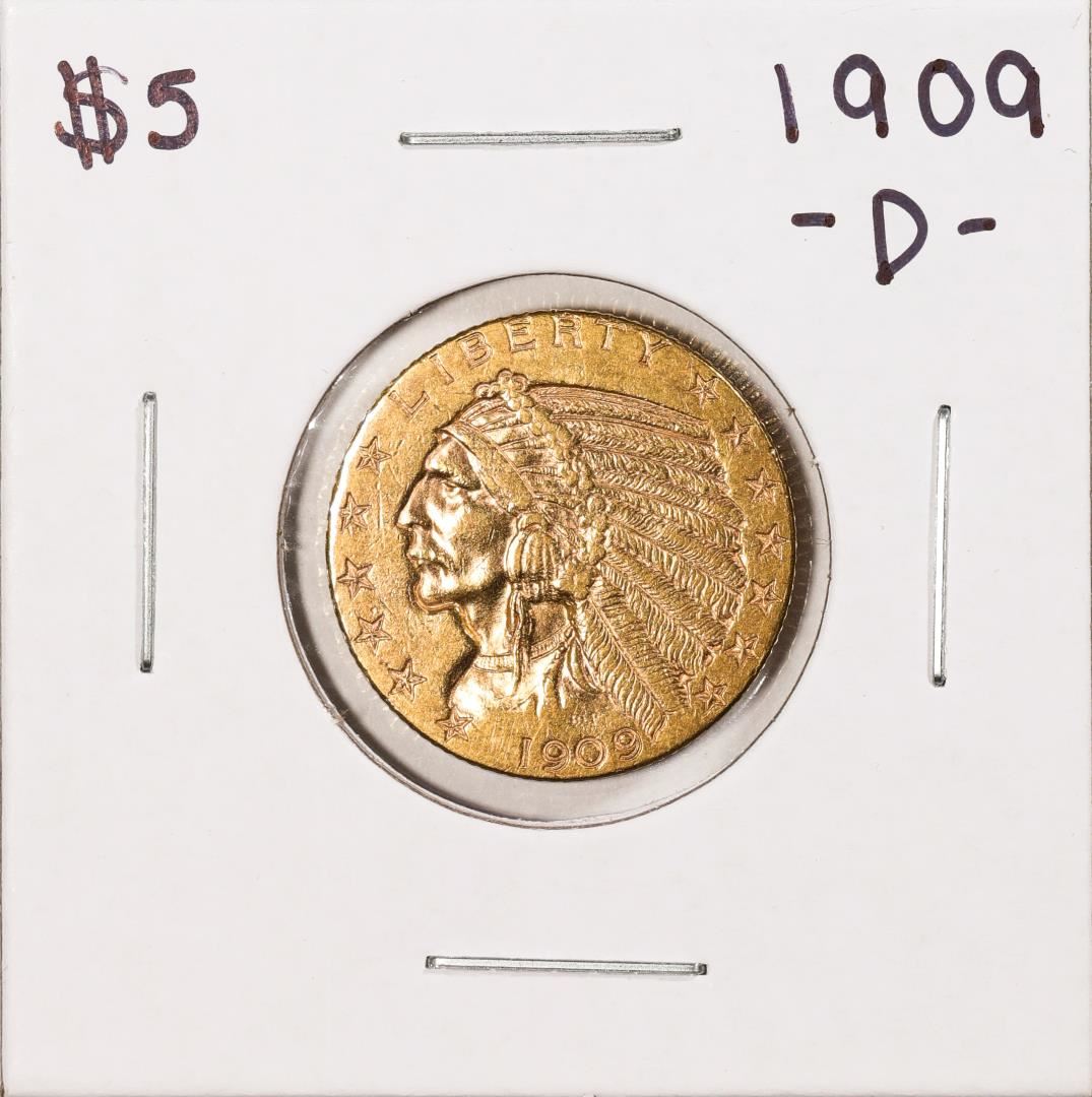 One 1909-D $5 Indian Head Half Eagle Gold Coin.