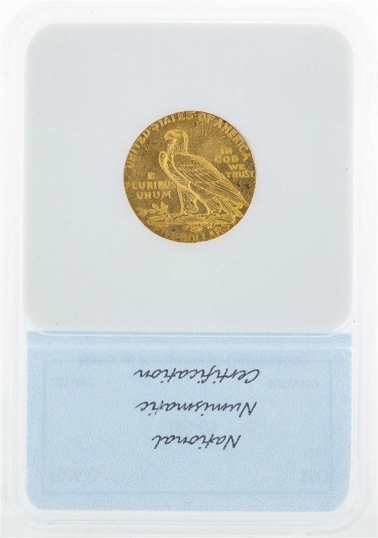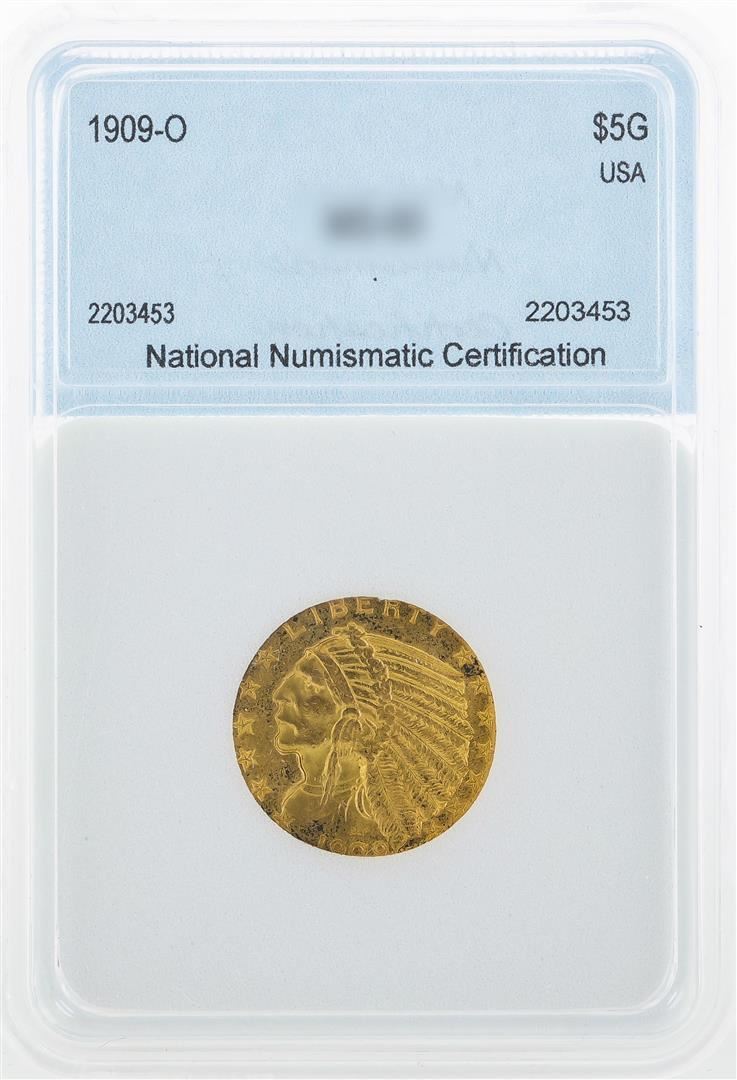One 1909-O $5 Indian Head Half Eagle Gold Coin. The 1909-O is the final gold coin struck at the New Orleans mint. It is also the only O mint indian design gold coin. The key to the series with a mintage of just 34,200. This coin has been graded by "National Numismatic Certification" company. However, since it is not one of the main numismatic certification companies that we currently recognize, we purposely blurred out the assigned grade of the coin to avoid any confusion. We encourage each bidder to make their own determination as to the grade & value of the coin.