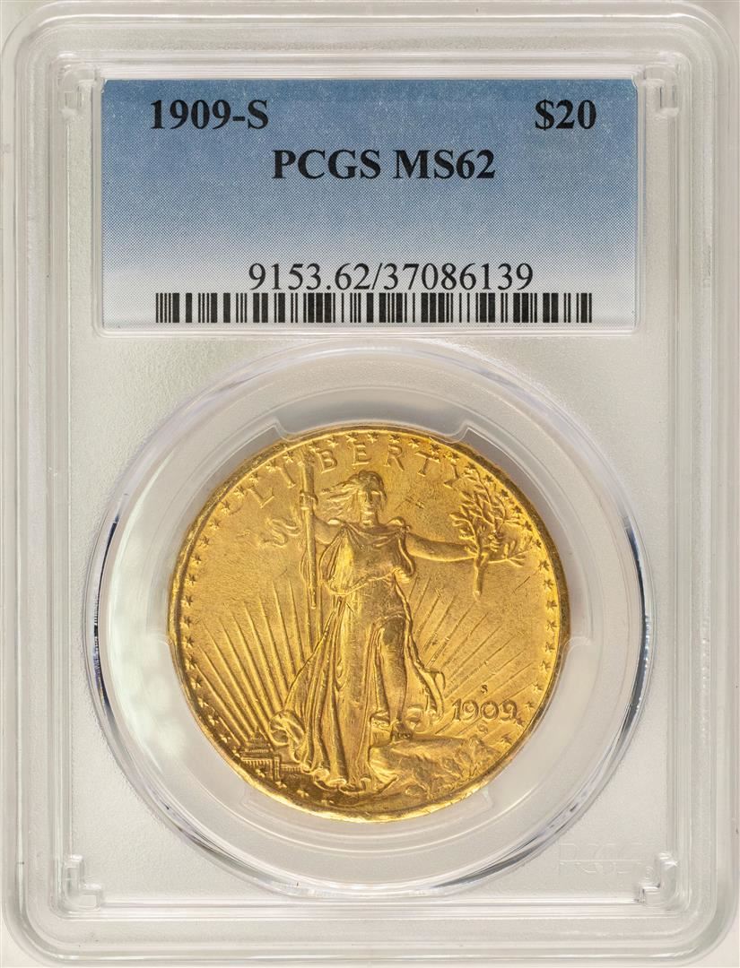 One 1909-S $20 St. Gaudens Double Eagle Gold Coin PCGS MS62. PCGS Graded.