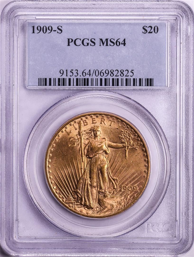 One 1909-S $20 St. Gaudens Double Eagle Gold Coin PCGS MS64. PCGS Graded.